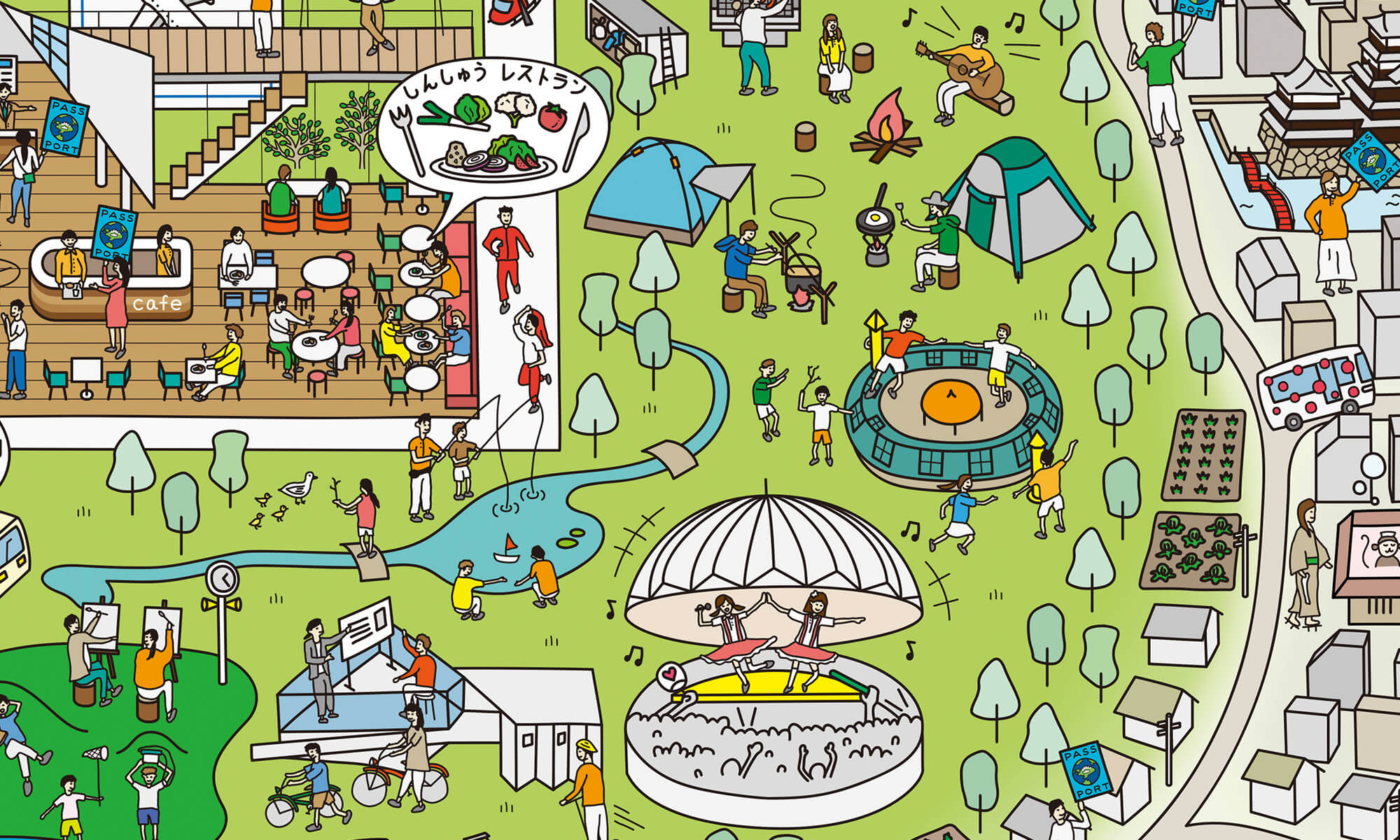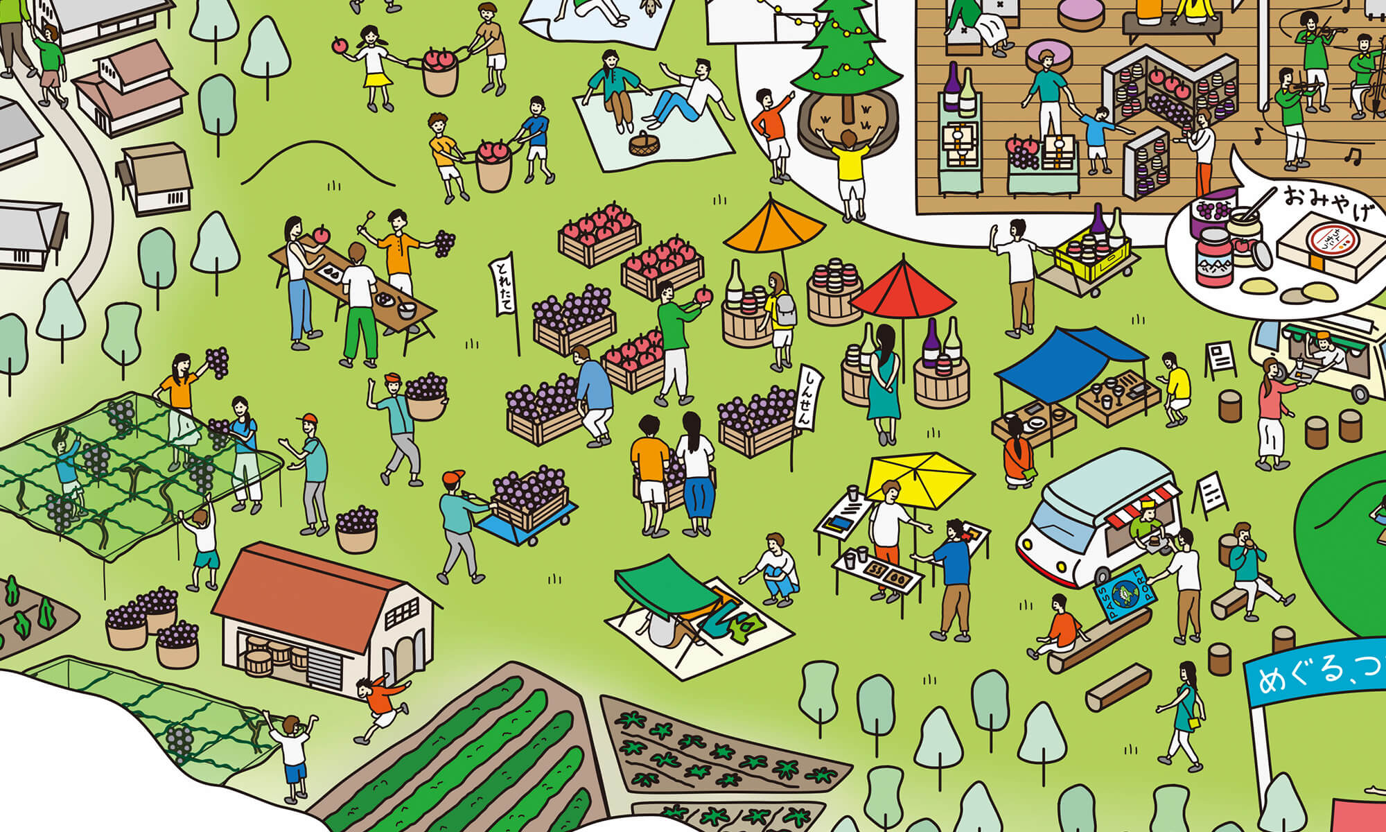 松本青年会議所が進める「信州まつもと空港ビジョン」として、中高生と一緒にワークショップやリサーチを行い、空港の活性化策をドローイングに表しました。果樹を活用した土産品の開発や、地域を結ぶ二次交通の改善策を提案し、空港利用に留まらない公共空間の活用を促進する方針としました。